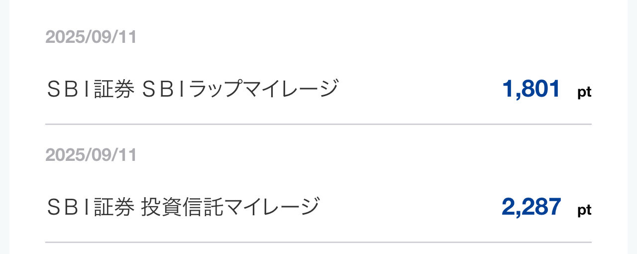 投資信託を保有しているだけで、SBI証券はポイントを与えてくれる。投信マイレージというサービスがそれだ。投資している金額と投資信託によって率は異なるが、自分の場合はこんな感じで毎月ポイントが入ってくる。