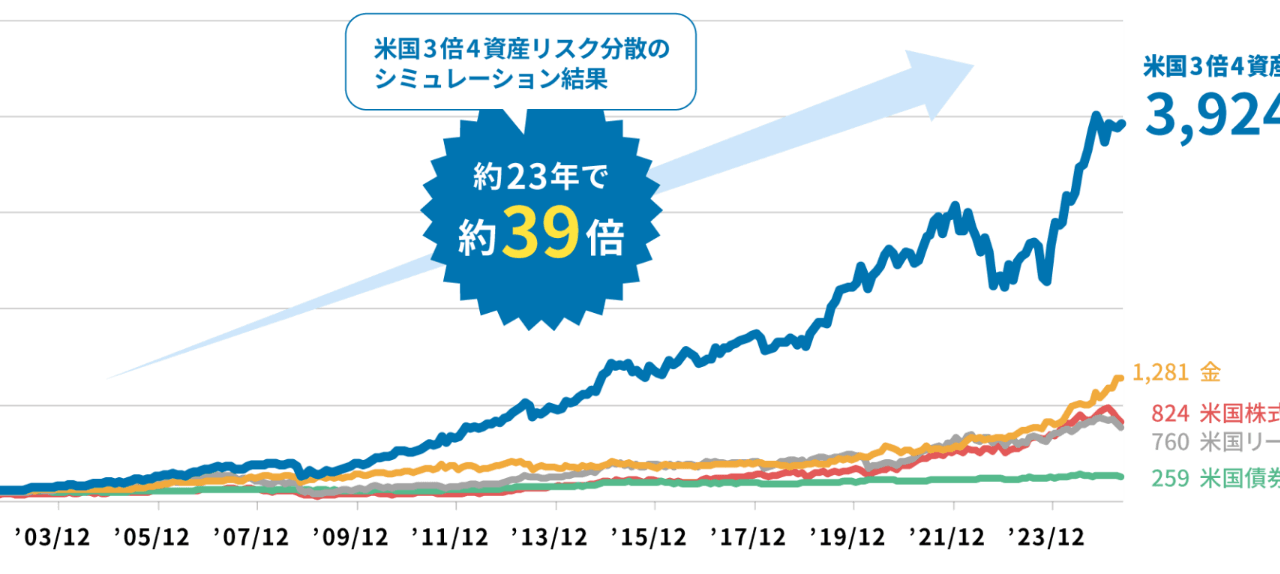 愛称はアメリカまるごとレバレッジ。このシンプルで大胆な名称が好き。米国の株・債権・リート・金の4資産にバランスよく投資して、それに3倍のレバレッジをかけて運用する設計になっている。いわゆる「夢見る枠」投資のひとつとしてはオススメ。