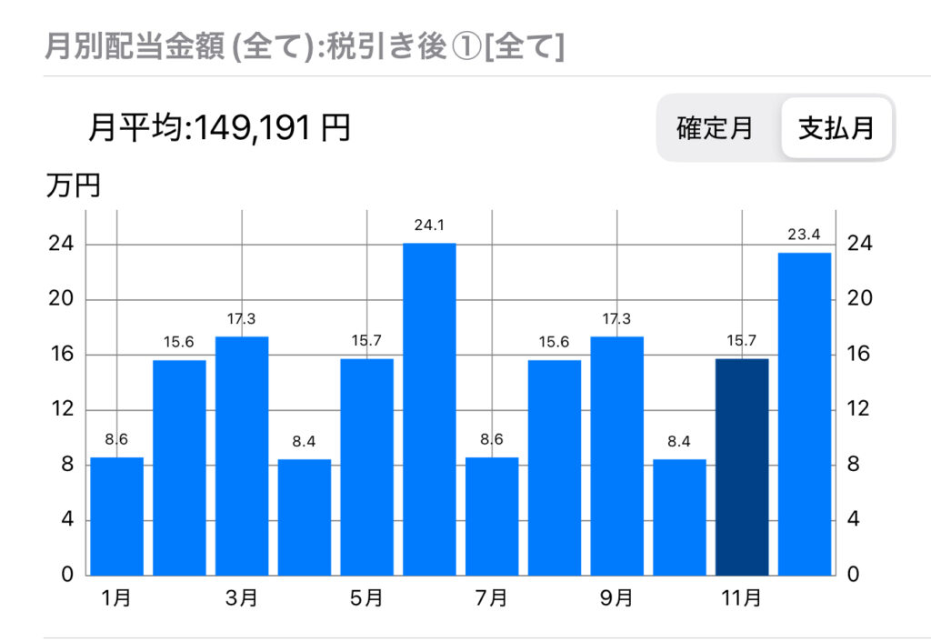 自分年金という呼び方をしているが、毎月の配当金/分配金の平均額(税引き後)がもうすぐ15万円になる。こうなってくると、1月4月7月10月の入金額を増やしたいと思うのが無駄に神経質な自分という生き物である。平均を均しつつ、全体の収入をあげていくことを目指したい。