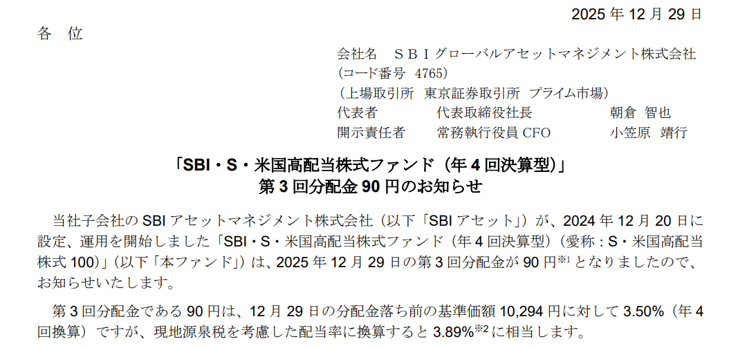 | 2025/12/06 | SBI・V・米国高配当株式インデックスF(年4回) | SBI | 30000 | |
