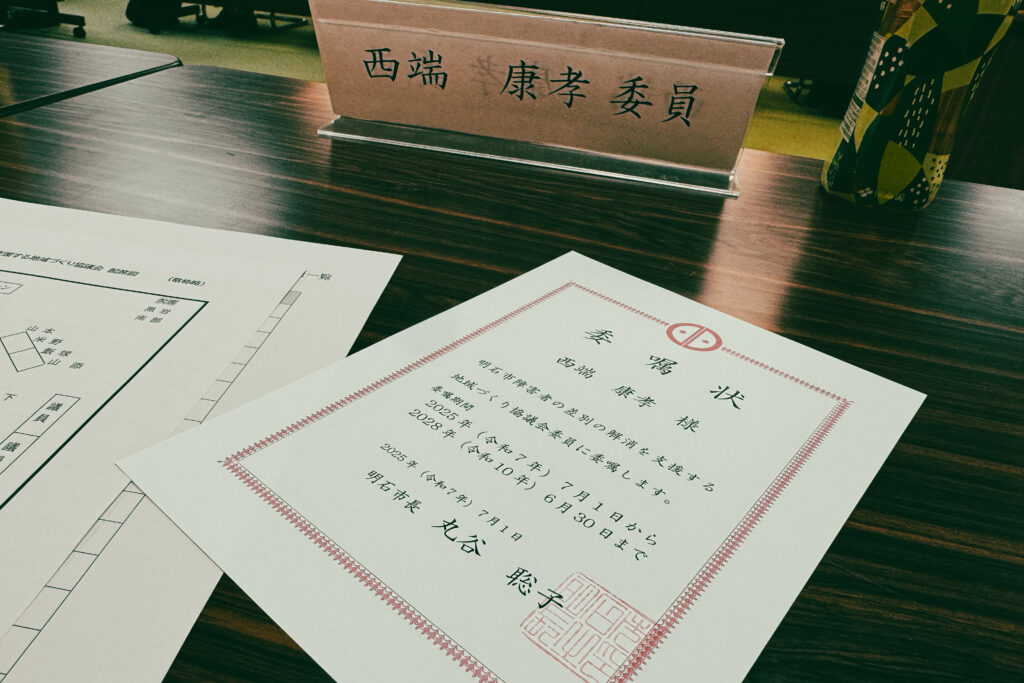 明石市障害者の差別の解消を支援する地域づくり協議会(インクルーシブ推進)委員に再び委嘱されたので、その会議に出席。任期は3年。
